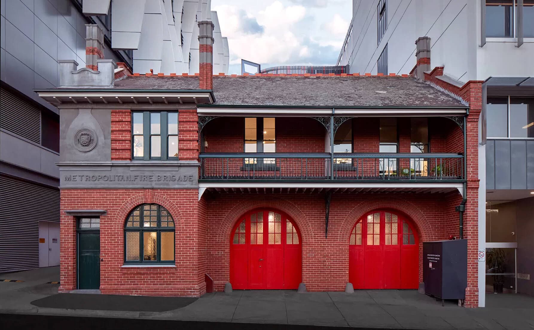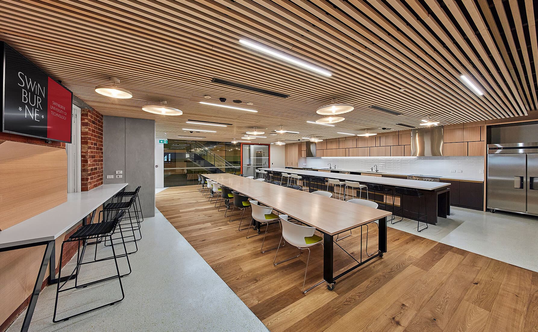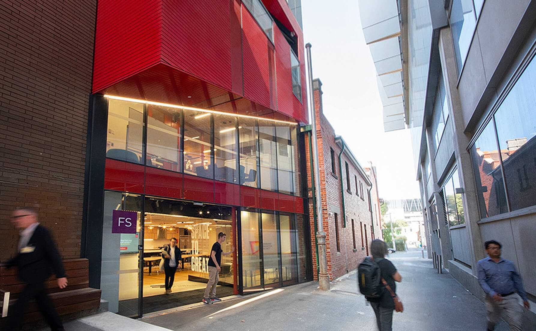 The scope of work, although built in one stage, involved two completely different work zones. Zone one included the complete restoration of an existing heritage listed 1910 fire station. The repurposed two-level building now houses Swinburne’s Innovation Precinct, a central hub on campus with collaborative spaces for entrepreneurial activity. The old fire truck garages now house an IP clinic, prototyping spaces and Design Factory Melbourne studio. Level two houses refurbished administration, staff office and meeting rooms. Zone two included a new, five-level concrete frame extension at the rear of the Fire Station.