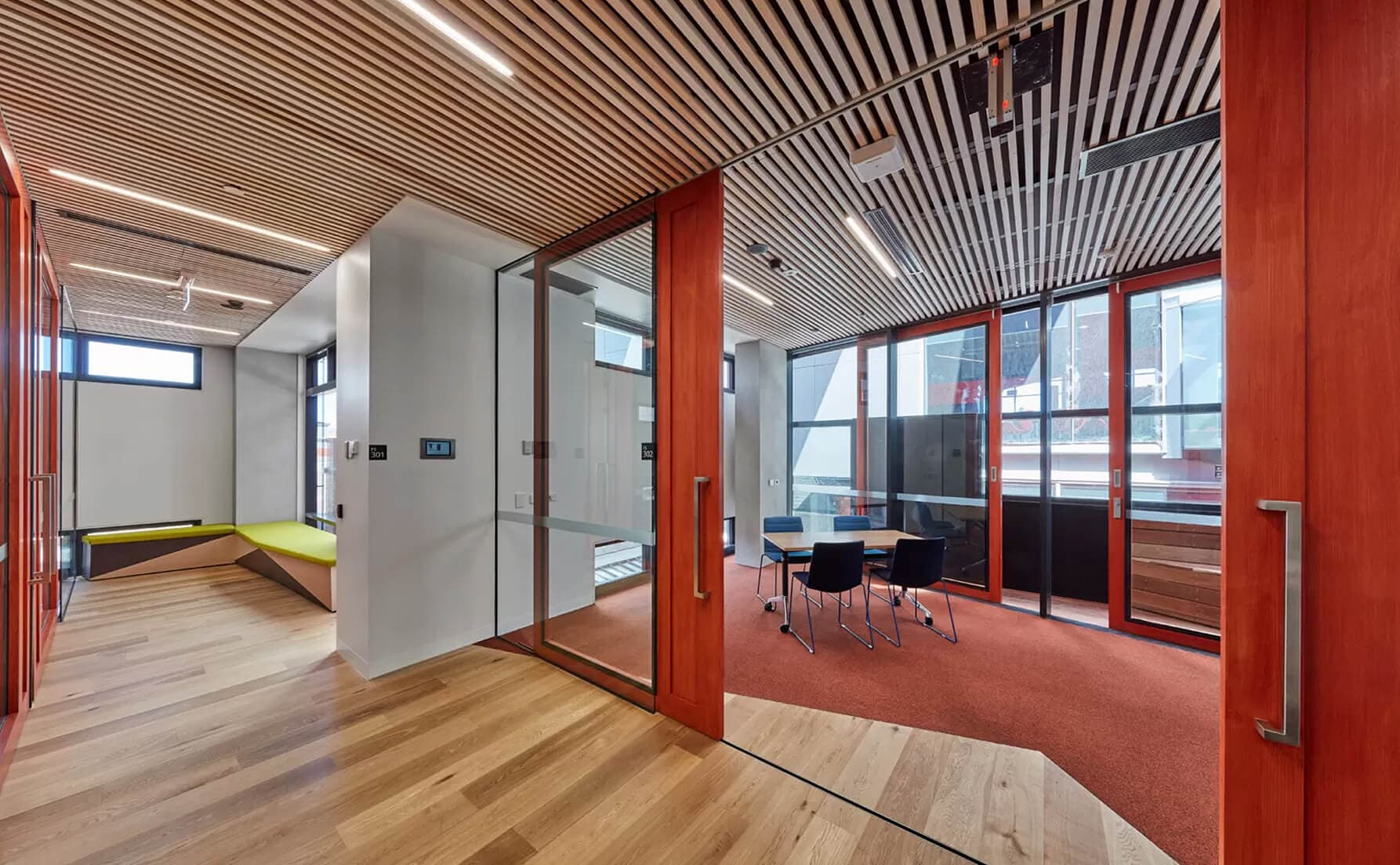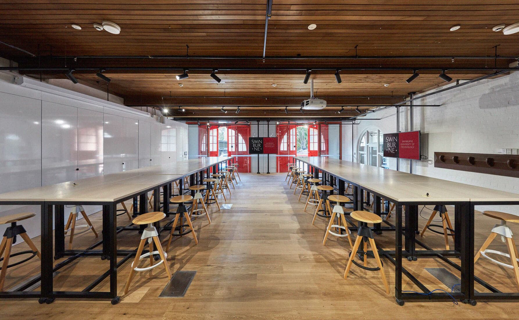 The scope of work, although built in one stage, involved two completely different work zones. Zone one included the complete restoration of an existing heritage listed 1910 fire station. The repurposed two-level building now houses Swinburne’s Innovation Precinct, a central hub on campus with collaborative spaces for entrepreneurial activity. The old fire truck garages now house an IP clinic, prototyping spaces and Design Factory Melbourne studio. Level two houses refurbished administration, staff office and meeting rooms. Zone two included a new, five-level concrete frame extension at the rear of the Fire Station.